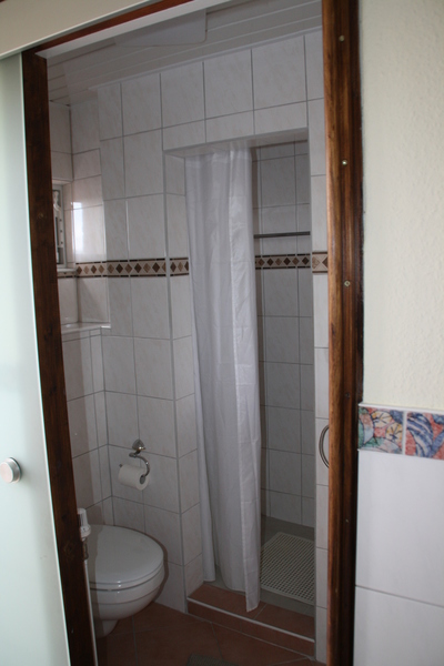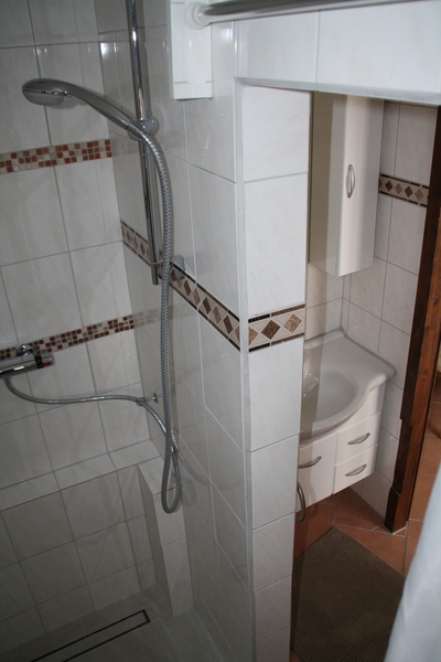 Das Duschbad ist ausgestattet mit Spiegelschrank, ausziehbarem Schminkspiegel und Föhn; die Dusche ist über eine Stufe ebenerdig begehbar.