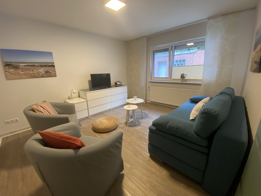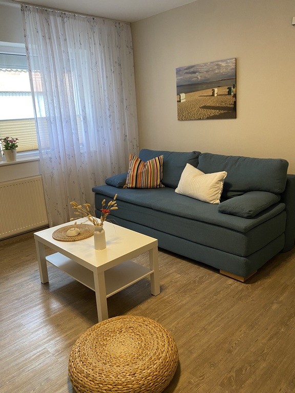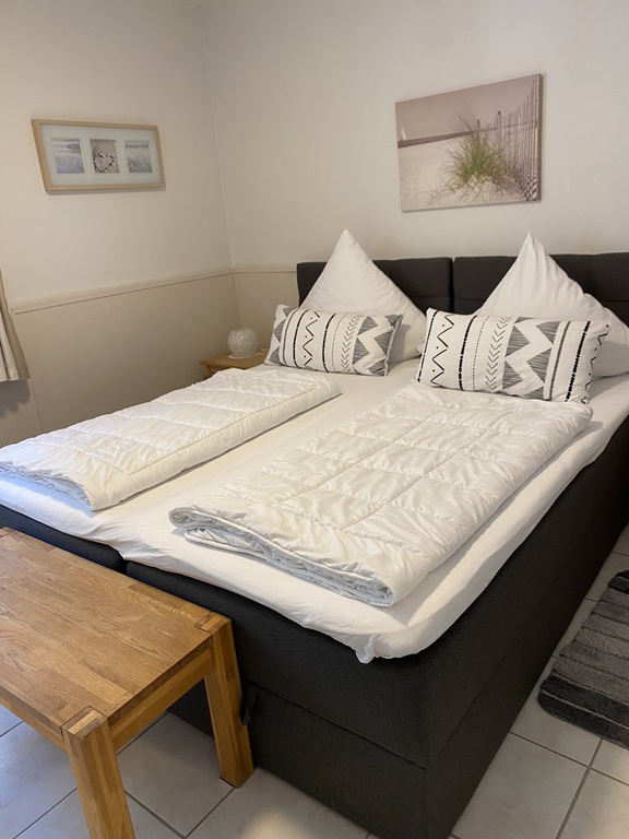 Moderne, gemütlich eingerichtete Wohnung, ausgelegt für 2 - 3 Personen, bestehend aus 1 Wohn-/Schlafraum mit Boxspring-Schlafcouch 1,60 x 2,00 und Schlafzimmer, ausgestattet mit Boxspringbetten 1,80 x 2,00 m, Platz für ein Kinderreisebett ist vorhanden.